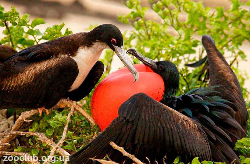 Фрегаты птицы моногамные, выбирают партнера один раз на всю жизнь. В момент размножения и высиживания они находятся не на привычной воздушной территории, поэтому очень уязвимы. Понимая это, они гнездятся на пустынных побережьях или островах, там, где нет хищников.