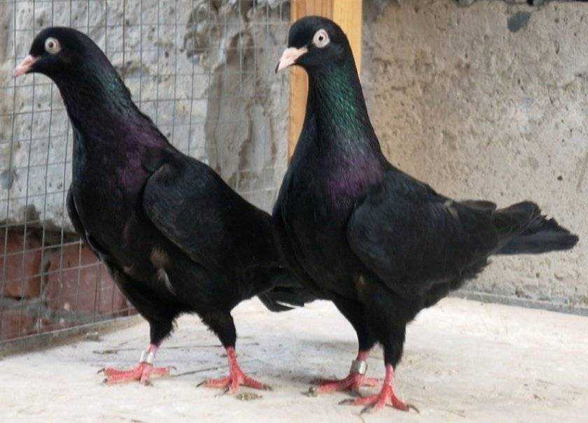 - Тип 2. Эти птицы немного меньше предыдущего типа. Корпус присажен, слегка вытянут. Голова маленькая. Шея стройная и красивая. Грудь и спина соответствуют первому типу. Окрас черный, может быть с зеленоватым отливом. Цвет глаз разный: коричневый, черный, красноватый. Может наблюдаться разный окрас глаз у одной особи. Клюв неширокий, светлых оттенков. Лапы красного цвета. Хвост длинный, красивый, особенно ценен черного цвета. Летные данные великолепные.