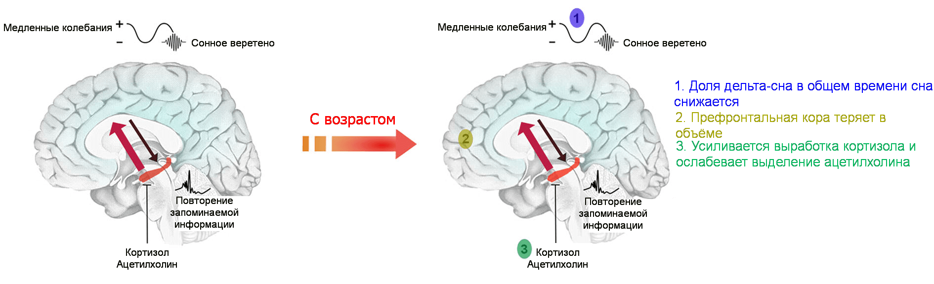 Рисунок 2. Возрастное изменение активности передачи сигналов из гиппокампа в кору больших полушарий во время сна. По мере старения доля медленноволновых колебаний в общем времени сна снижается, постепенно деградирует префронтальная кора, повышается уровень кортизола и падает концентрация ацетилхолина.