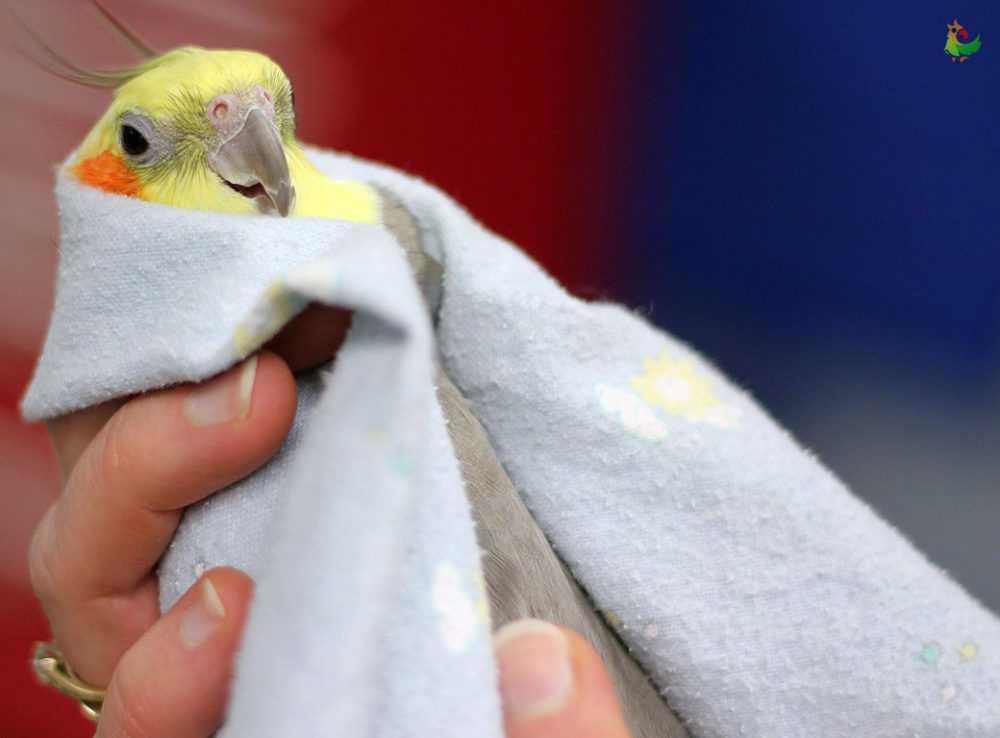 Если попугайчик никак не обсохнет, его можно промокнуть чистым полотенцем или сухими бумажными салфетками. Нельзя сушить птицу никакими электрическими приборами. Их шум испугает пернатого, а горячий воздух пересушит кожу и перья.