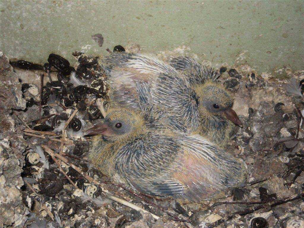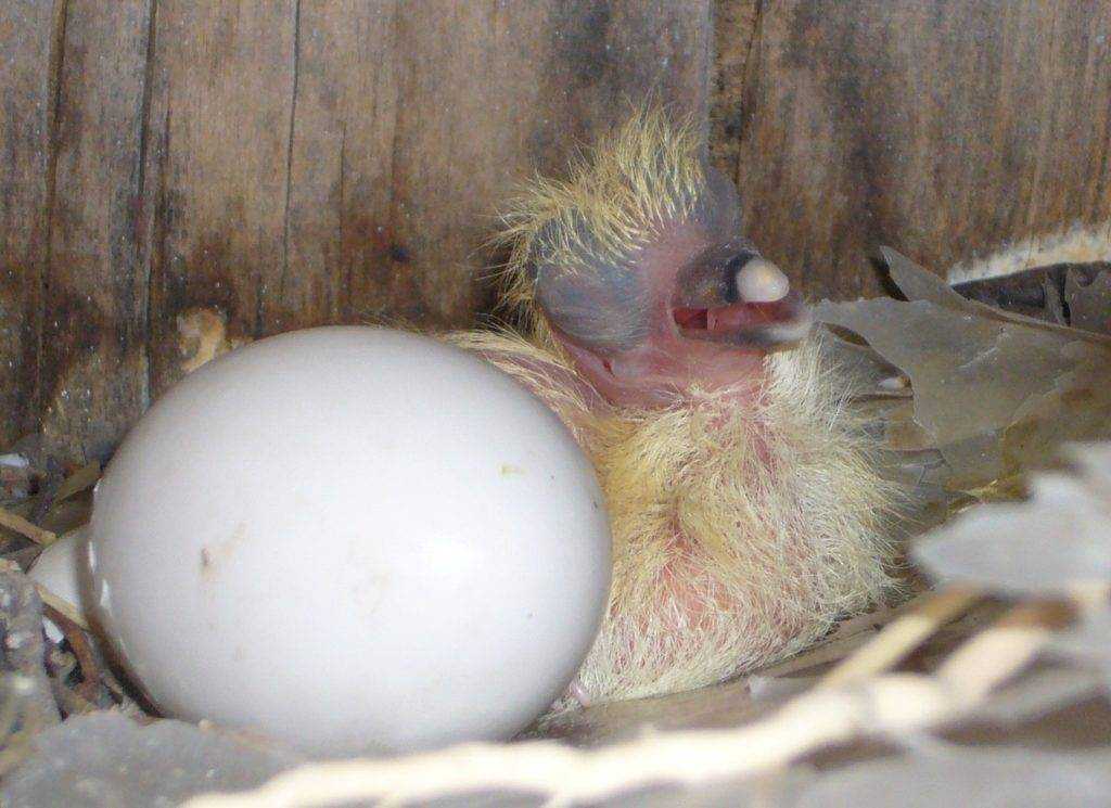 Большую часть времени яйца высиживает самка, но голубь самец тоже участвует в высидке. Через 16-19 дней появляются птенцы голубей, слепые и с желтым пушком. Они рождаются не одновременно, так как кладка яиц могла происходить с двухдневным перерывом. В первые дни родители кормят отпрысков отрыжкой из зоба. Потом в рацион добавляются семена. Когда проходит чуть больше месяца, молодые голуби начинают летать и становятся похожими на взрослых особей.