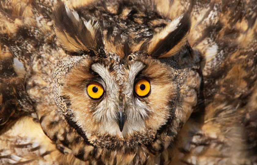 - У филина большие перьевые ушки, которые не свойственны многим разновидностям сычей.