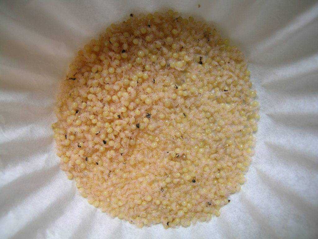 Через определенный период времени из яиц появляются новорожденные паучки-нимфы, которые первое время совсем не питаются, поэтому живут вместе без угрозы каннибализма. После 2 линек нимфа становится личинкой, которая похожа на сформировавшегося паука, но, в отличие от него, все еще имеет запас питательных веществ в брюшке.