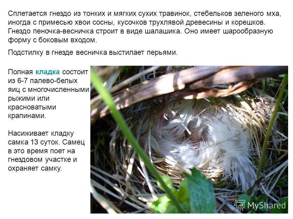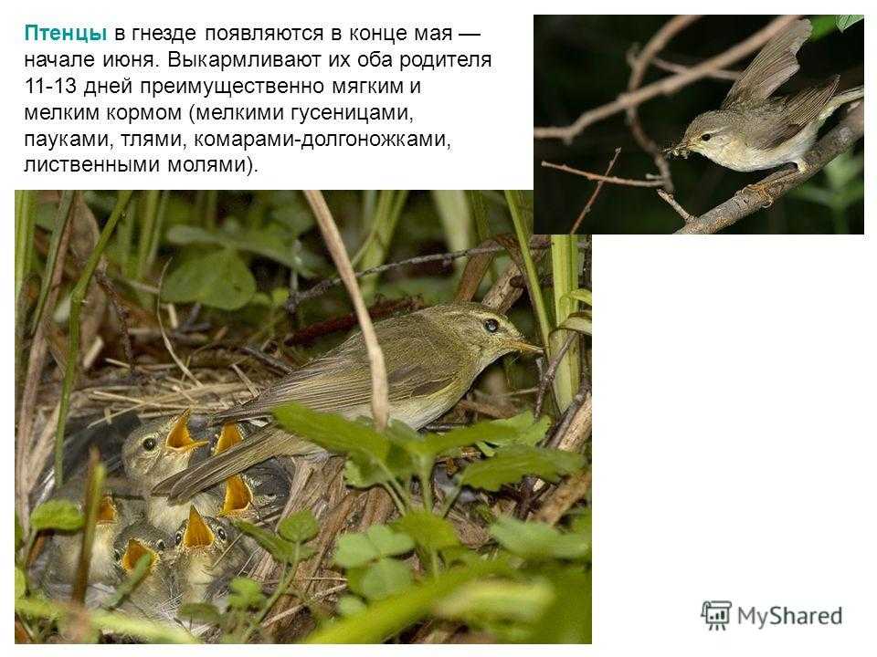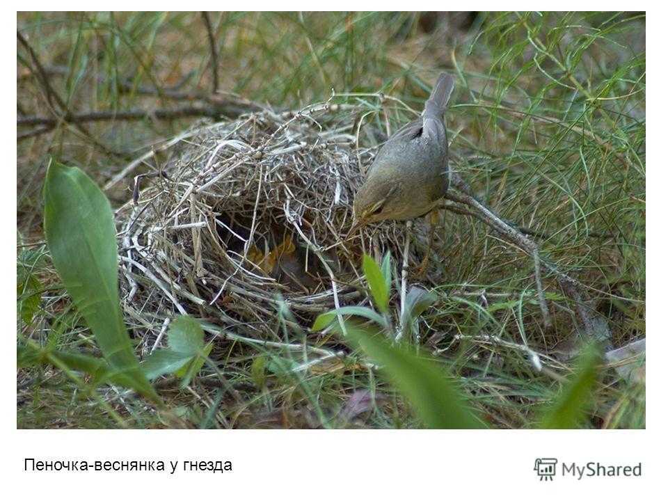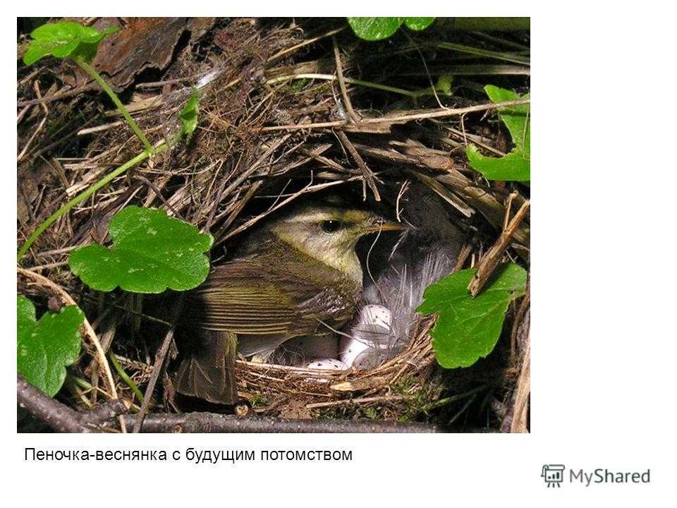 Прилетев с кормом, пеночка садится на ветку, находящуюся выше гнезда и осматривается вокруг. Только убедившись, что нет никакой опасности, она медленно соскальзывает в гнездо