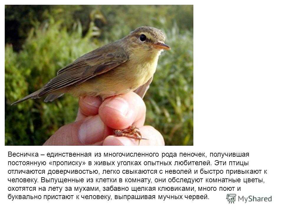 Весничка – единственная из многочисленного рода пеночек, получившая постоянную «прописку» в живых уголках опытных любителей. Эти птицы отличаются доверчивостью, легко свыкаются с неволей и быстро привыкают к человеку. Выпущенные из клетки в комнату, они обследуют комнатные цветы, охотятся на лету за мухами, забавно щелкая клювиками, много поют и буквально пристают к человеку, выпрашивая мучных червей.