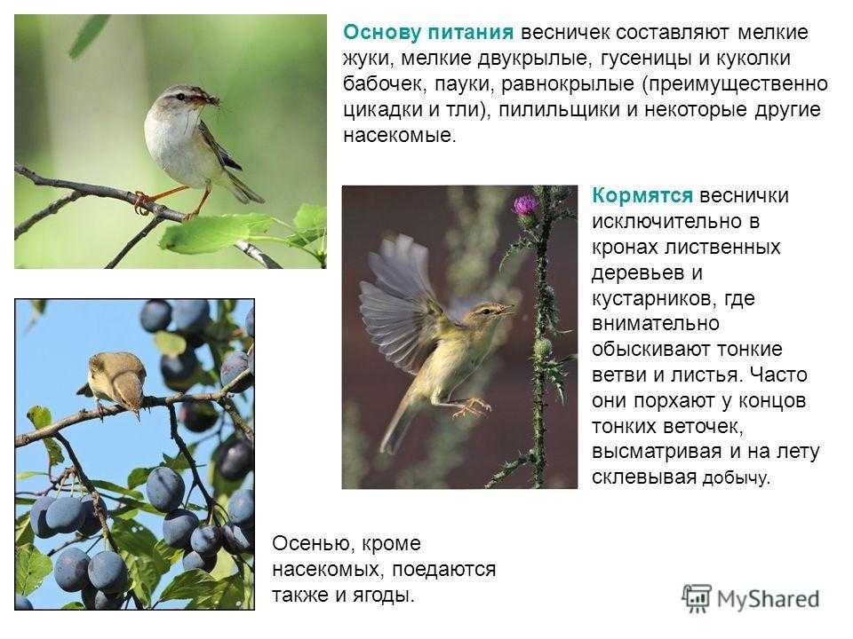 Пеночка-весничка предпочитает селиться в садах, парках, смешанных и лиственных лесах, а вот густых чащ избегает. Песенки пеночки очень похожи на звуки зяблика, но с более замысловатыми и чистыми трелями. Они прилетают в начале апреля, а вот в конце июля уже снова собираются на зимовку. Их питанием являются мелкие насекомые – жуки, куколки бабочек, тля, цикады, мелкие пауки. Также не прочь птицы полакомиться и ягодами. Гнездо строят на земле в виде шалаша, используя стебли трав, листья, кусочки мха. Одна кладка – это 5-7 яиц, их поочередно насиживают самец и самка. Через 2 недели появляются птенцы, они быстро растут и уже через 2 недели покидают гнездо. В год веснички могут делать кладку дважды.
