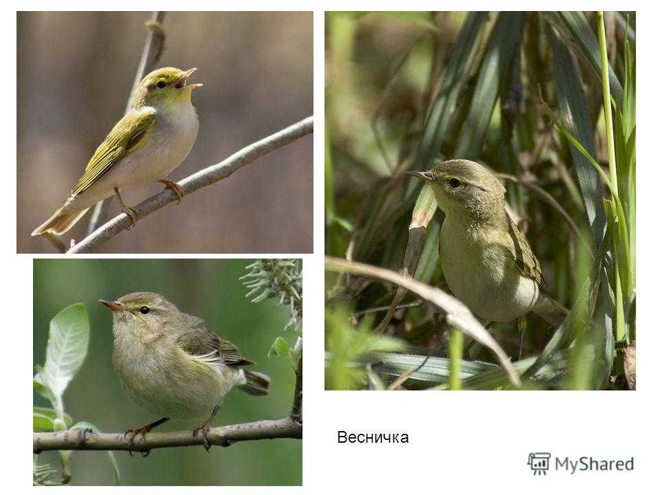 Пеночка-весничка – (Phylloscopus trochilus). Небольшая скромно окрашенная подвижная птичка размером меньше воробья (масса тела 6-11 г). Верх головы, спина, крылья, надхвостье и хвост зеленовато-бурые или оливково-серые. Подбородок, шея, грудь желтовато-белые. Брюшко, подхвостье грязновато-белые. Над глазом заметна светлая «бровь». Ноги светлые, крыло без светлых полос.