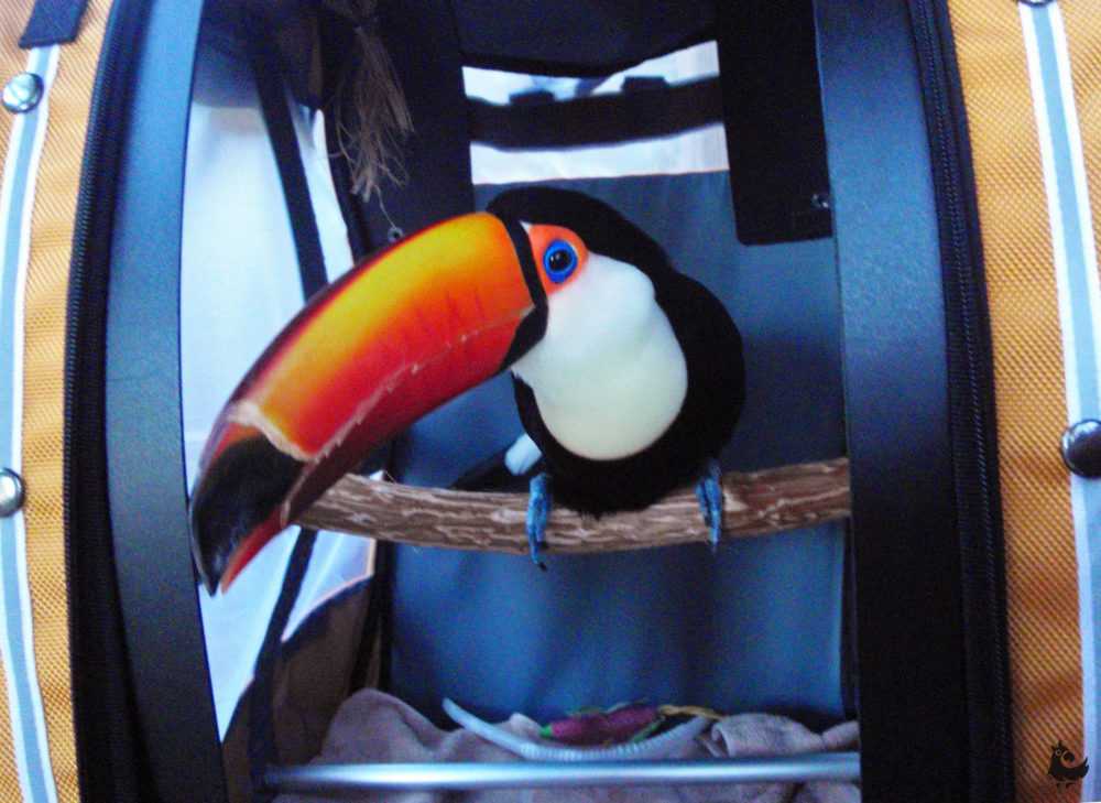Обычно такие переноски накрывают тканью перед «выходом в свет». Это нужно для того, чтобы птица не испугалась бликов света и мелькания незнакомых объектов.