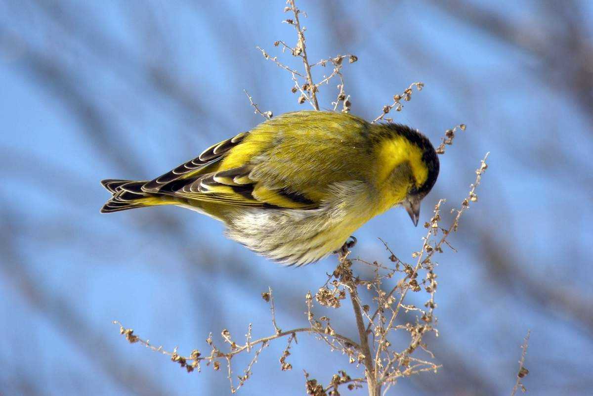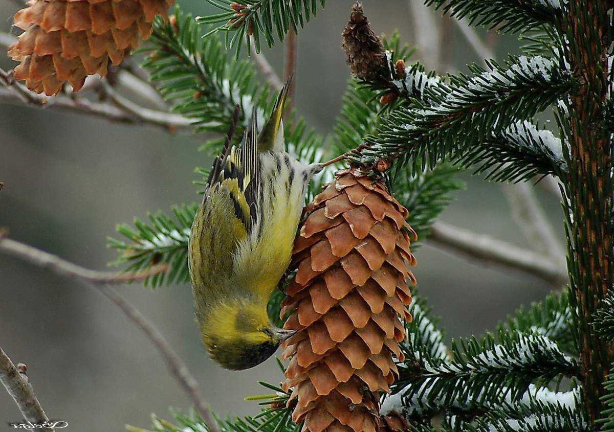 Иногда ловкие чижики так достают семечки — свое любимое лакомство.