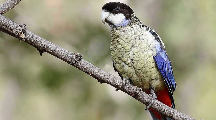Бледноголовая розелла. Имеет светло-лимонную окраску головы, щеки белые, плечи и спинку желтые с черными вкраплениями, грудку и живот голубоватые, крылья и хвост окрашены в черный, чередующийся с зеленовато-синим, цвет, окаймлены белым, подхвостье красное.