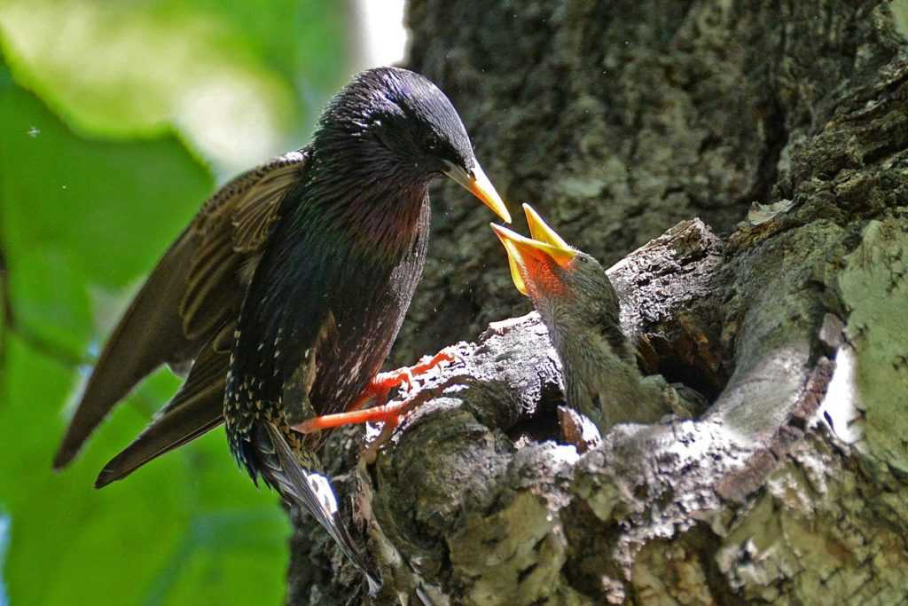 - Воспитанием потомства: у скворца яйца высиживает самка, изредка ее подменяет самец. Через – 11-13 дней вылупляются птенчики, которые в течение двух недель кормятся от обоих родителей по 10 раз в день. Дрозды кормят своих птенцов по 200 раз в день, занимаются этим также оба родителя. Интересно, что к моменту становления самостоятельными, половина выводка погибает.