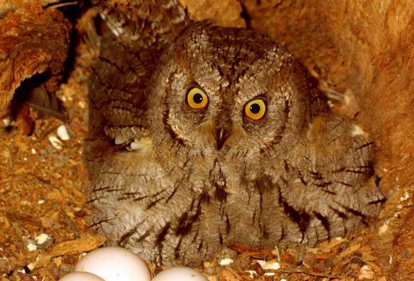 Милая по виду совка может стать отчаянной защитницей гнезда и кладки яиц, если почувствует приближение чужака. Расправив крылья как бабочка и закрывая гнездо, сплюшка