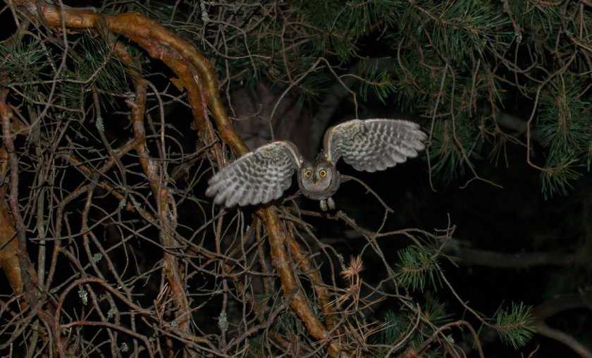 Едва заметив добычу, сова взлетает и схватывает ее. Зорька не проглатывает насекомое в полете, а вместе с ним возвращается на дерево и только потом принимается за еду.
