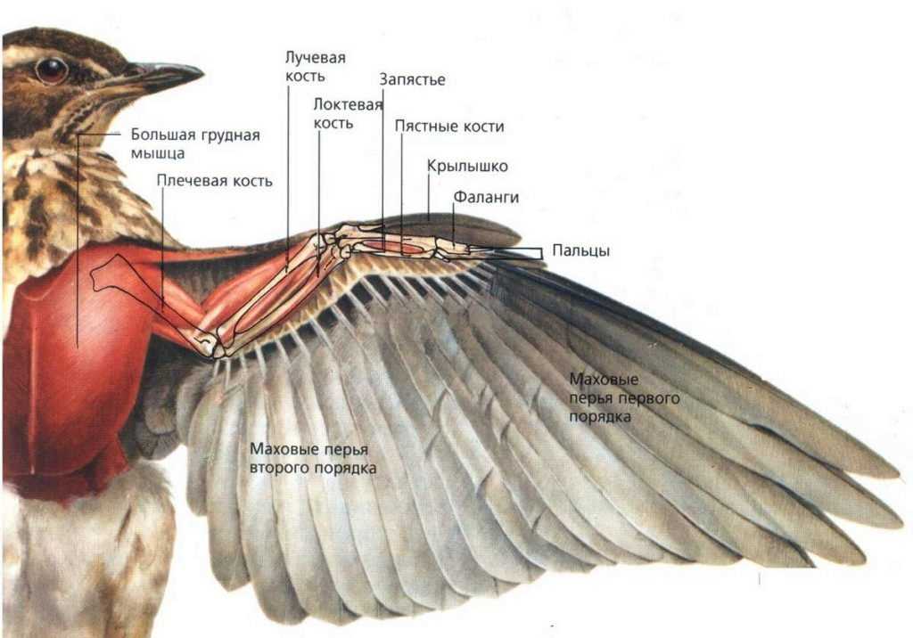 Причем в плечевой кости находится специфический воздушный мешок, который относится к дыхательной системе. Дополнительное облегчение крылу придает то, что крупные мышцы в нем отсутствуют. Вместо мышц главные движения крыльев контролируются с помощью сухожилий очень развитой мускулатуры грудины.