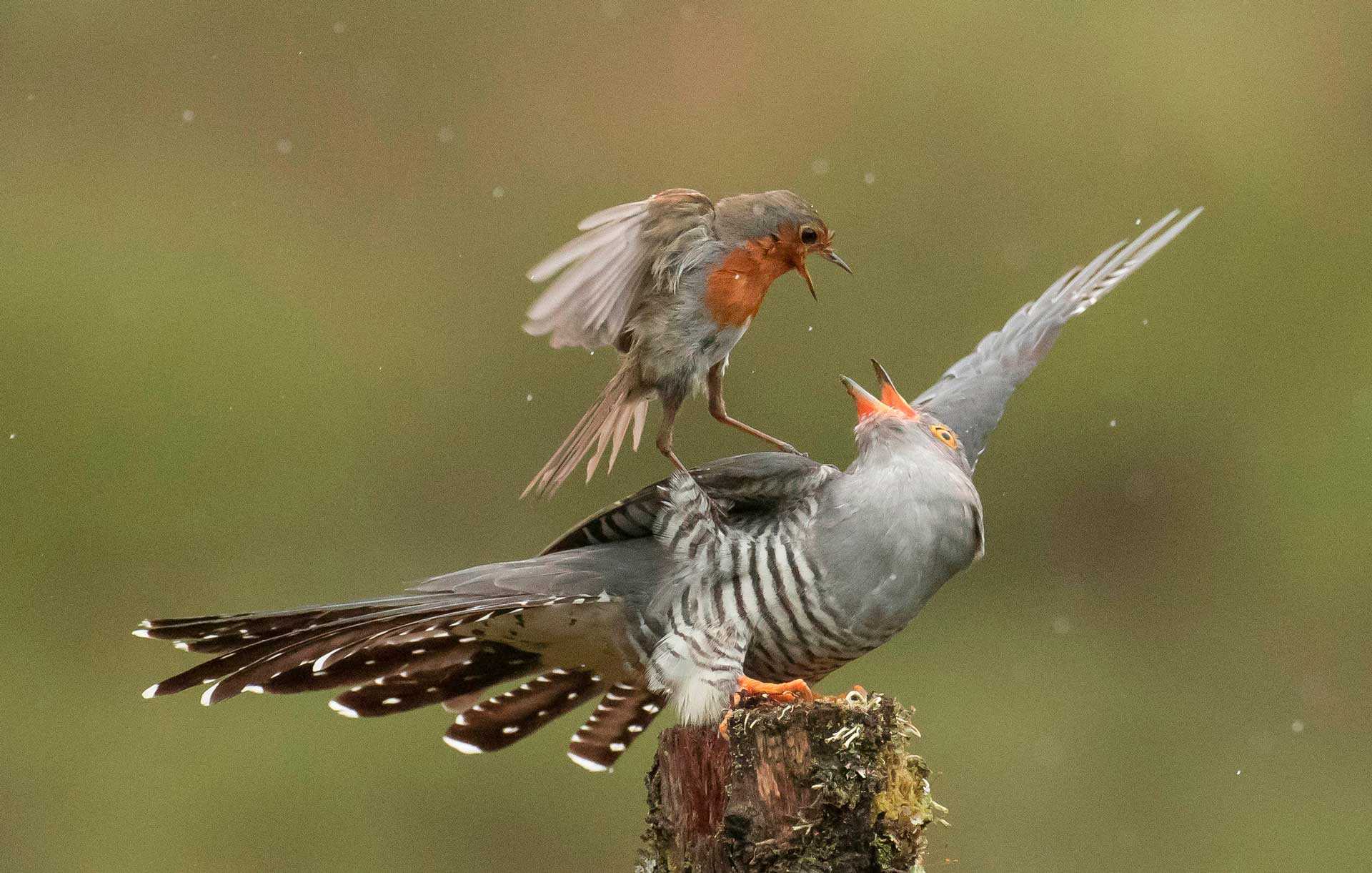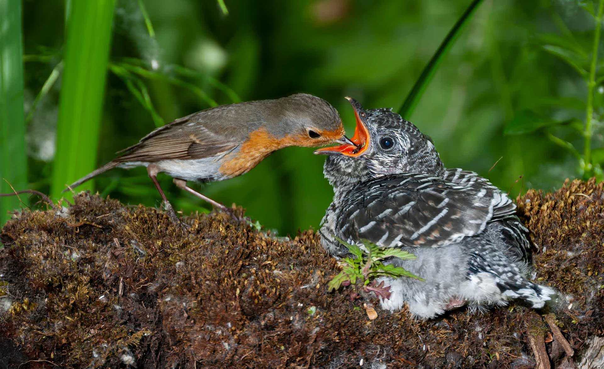 Иногда зарянка может отогнать кукушку от своего гнезда. Но увы, так бывает не всегда и эта птичка вскармливает подкидыша.