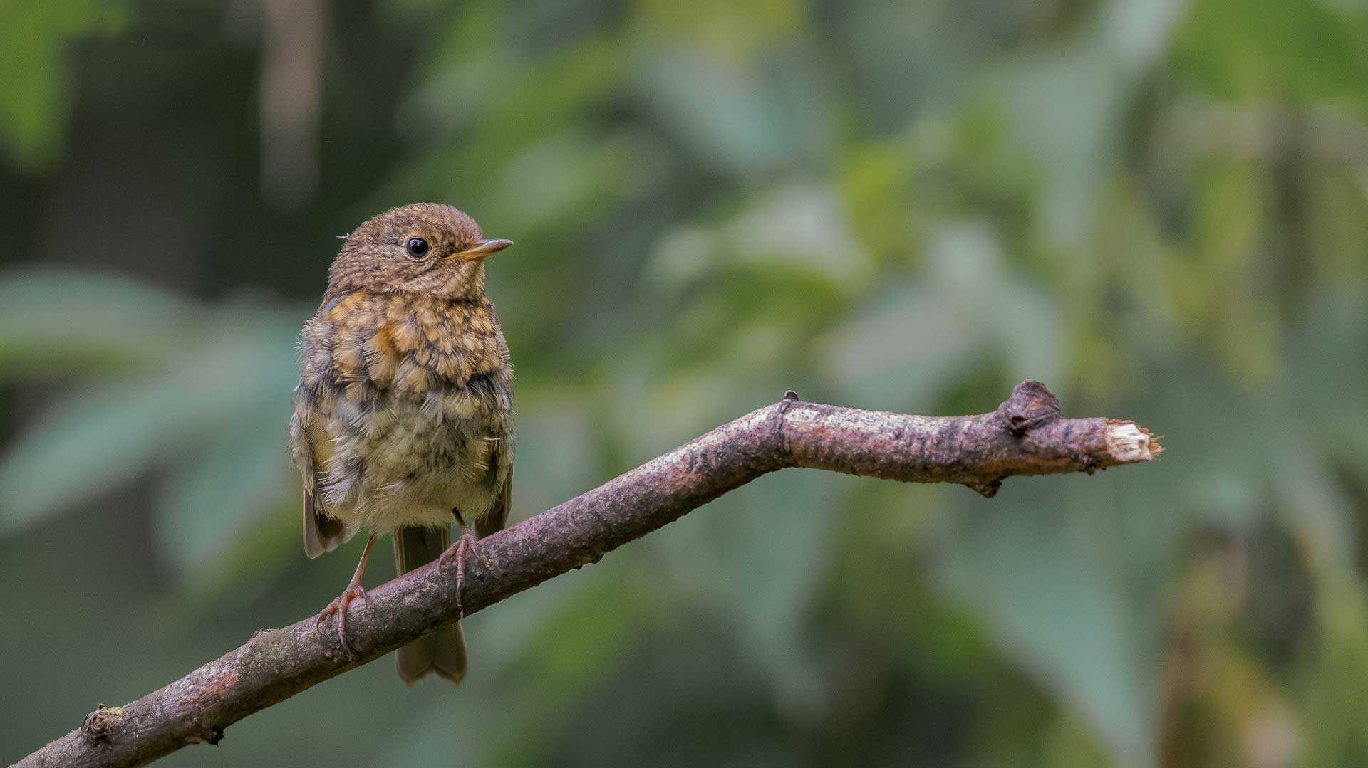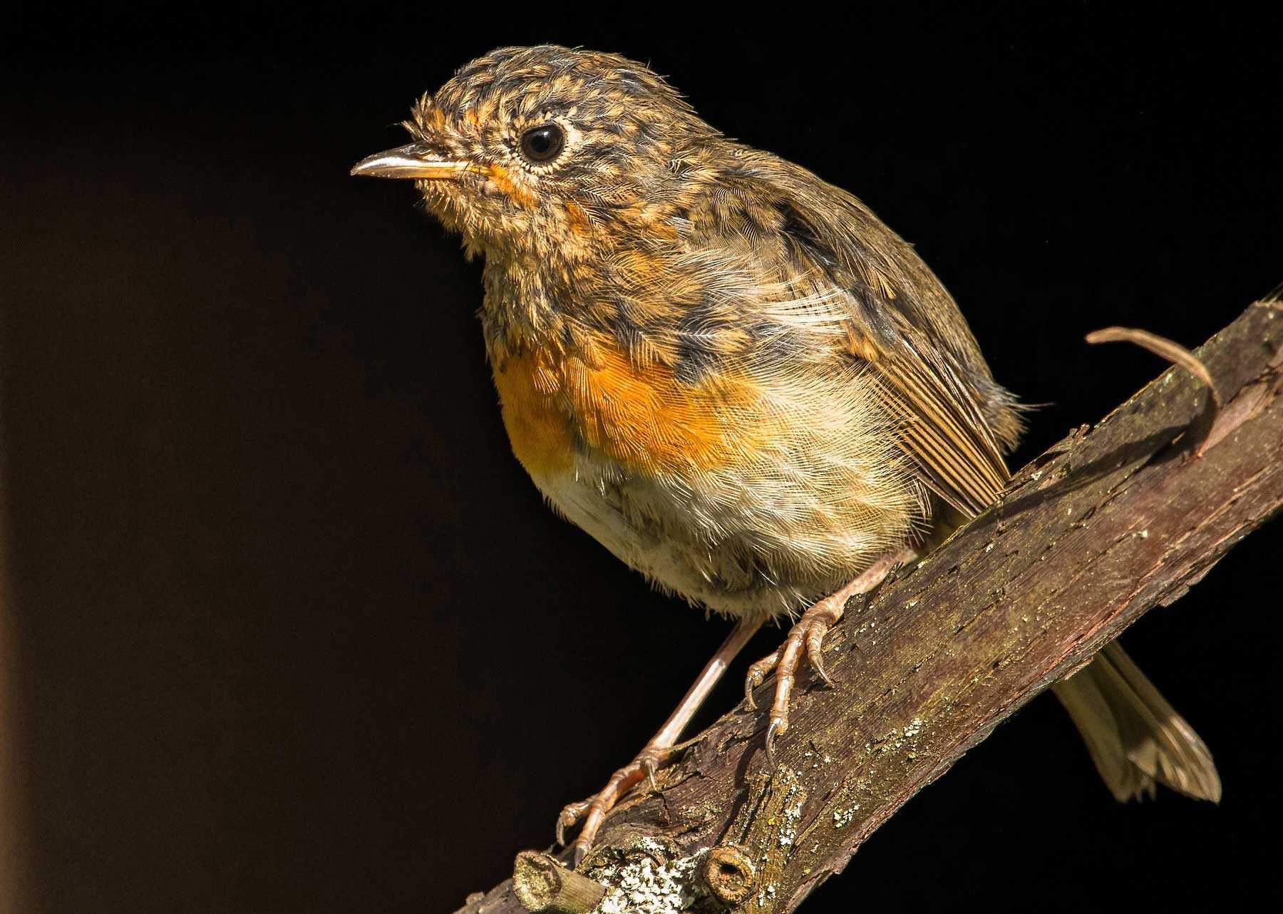 У молодых птенцов малиновки мягкое пестрое оперение