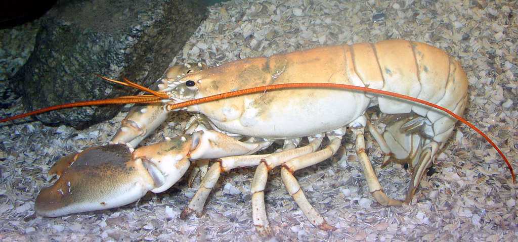 - Существуют очень редкие омары-альбиносы белого и полупрозрачного окраса. Такая нетипичная раскраска возникает из-за отсутствия в панцирях альбиносов пигмента астаксантина. Этот пигмент также отвечает за изменение цвета панциря на красный при термической обработке ракообразных.