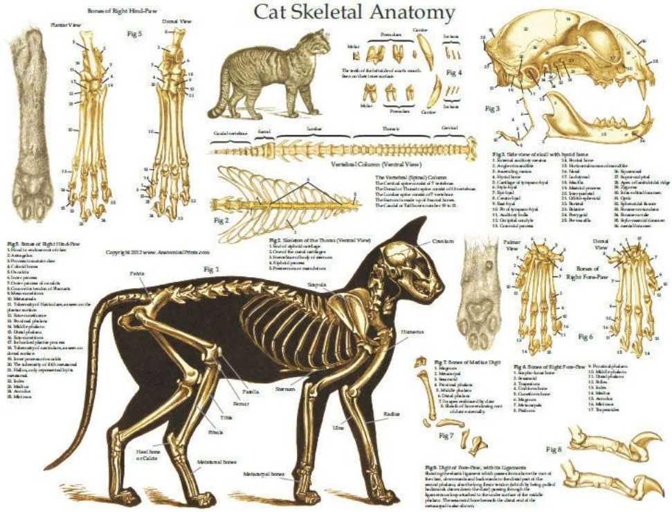 Скелет формирует остов кошачьего тела. Кости выполняют не только опорно-двигательную, но и защитную функцию. Кости черепа защищают мозг от механических повреждений, а ребра помогают уберечь в целости сердце и другие внутренние органы.
