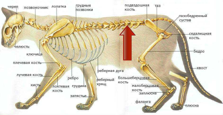 Крестовой отдел позвоночника называется коротко и ясно — крестцом. С ним состыковывается последний позвонок поясницы. Когда кошка прыгает, крестцовый диск становится основной точкой опоры.