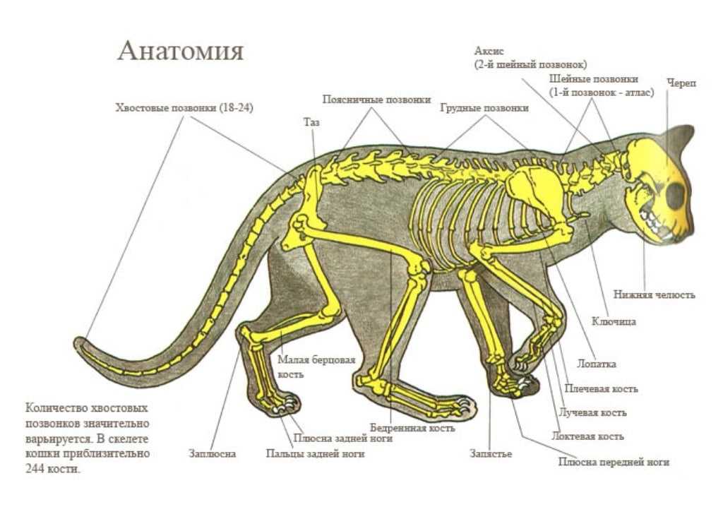 В скелете кошки в среднем 244-250 костей. В некоторых источниках указывается 230-236 костей. Видимо, некоторые из них срослись и принимаются за одну. Вообще, число костей варьируется в зависимости от длины хвоста (самый длинный у мейн-кунов, самый короткий у бобтейлов – курильских, японских). Некоторые кости срастаются у кошек с возрастом. Швы между сросшимися костями состоят из очень твердой ткани. При сильном механическом воздействии на кости она ломается в месте шва. В природе дикие кошки самостоятельно восстанавливаются после таких травм, домашним же нужна помощь ветеринара.
