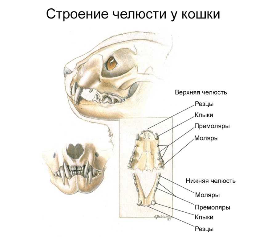 Кошки – хищники, именно с этим фактом связаны особенности строения их челюсти. У взрослого животного насчитывают 30 зубов: 12 резцов, 4 клыка, 10 предкоренных и 4 коренных зуба.