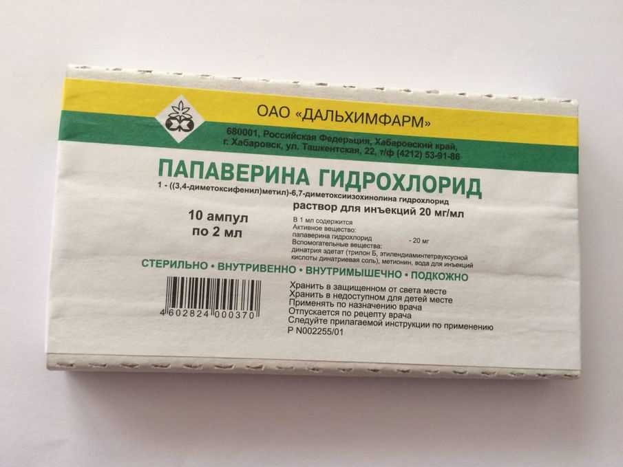 - Раствор для инъекций. Прозрачная жидкость фасуется в стеклянные запаянные ампулы. Некоторые производители используют флаконы с пластиковым колпаком. Они считаются более удобными в применении, так как отсутствует риск ранения стеклом при открывании. 1 мл раствора обычно содержит 20 мг папаверина гидрохлорида. Также в состав входит очищенная вода и другие компоненты.
