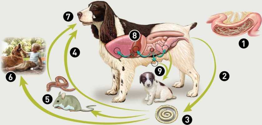 Важно! Если у собаки когда-либо были круглые черви, в тканях организма может оставаться некоторое количество бездействующих («инцистированных») личинок, даже если собаку лечили от глистов. Эти инцистированные личинки могут оставаться бездействующими до конца жизни зверя или активироваться при передаче щенкам во внутриутробном периоде развития.