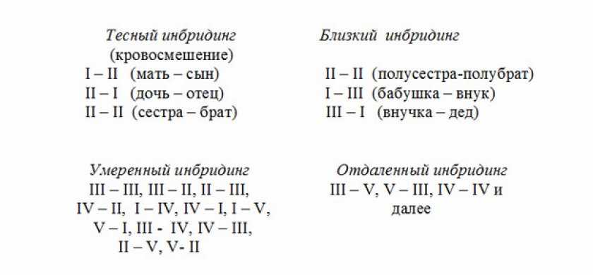 Для сохранения всех качеств определенной породы к скрещиванию могут допускаться животные первой линии родства. В зависимости от близости скрещивания, инбридинг делится на типы по степени родства: