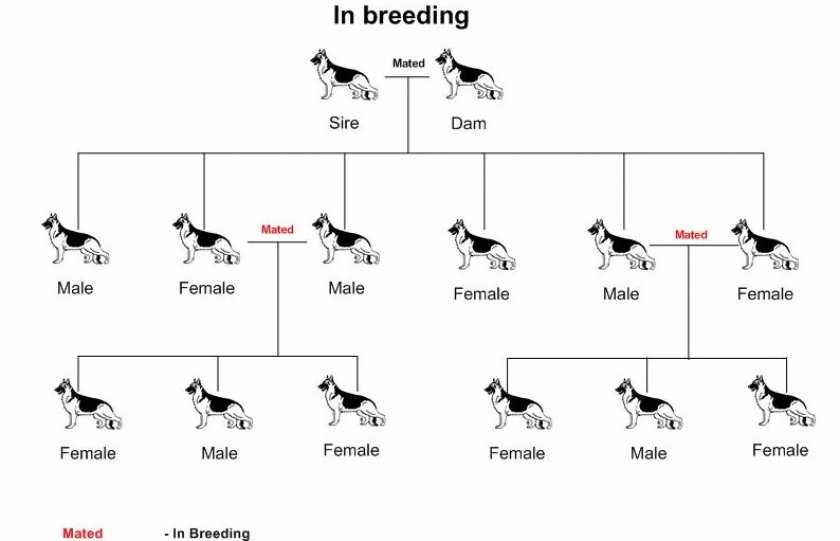 Для спаривания берутся собаки, находящиеся в прямой родственной связи (то есть, используется кровосмешение). Эти связки обычно имеют вид:
