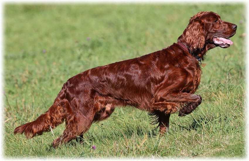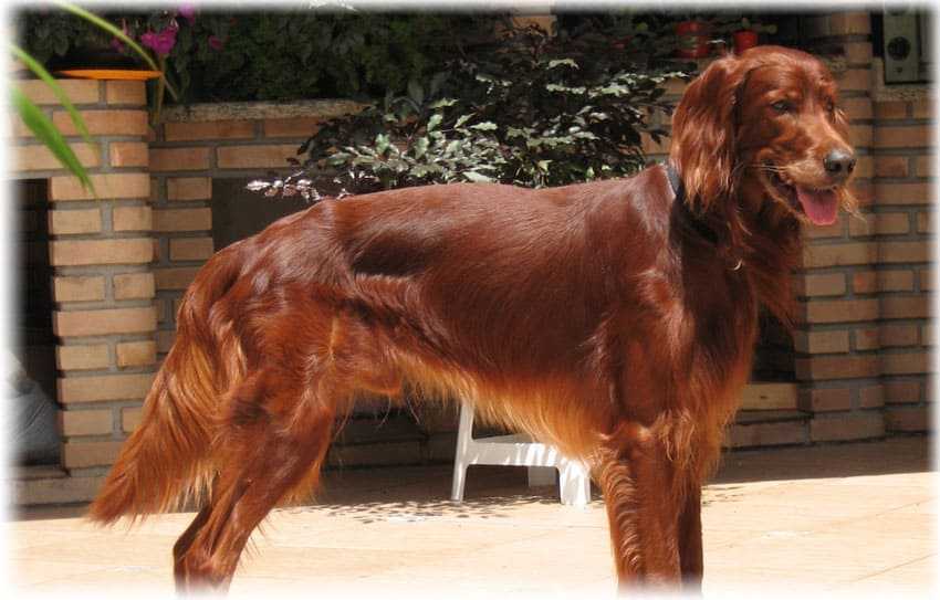 Ирландский сеттер – средняя собака роскошного красно-рыжего окраса, пропорционально сложенная с сухой и крепкой конституцией, высокая в ногах.