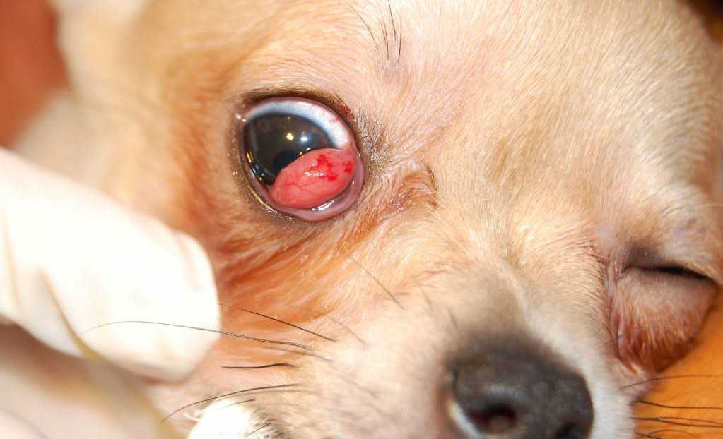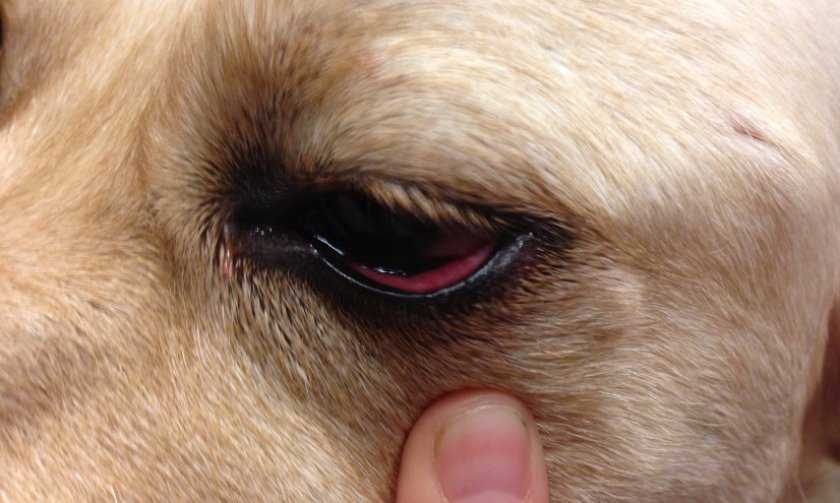 С ней все довольно просто, симптомы достаточно сложно перепутать с чем-то другим. Сперва на поверхности конъюнктивальной оболочки появляются небольшие новообразования «бородавочного» вида, красновато-серого цвета. Развивается сильный отек третьего века, оно «сползает» вниз, становясь видимым. Из уголков глаза наблюдаются обильные истечения катарально-гнойного экссудата, из-за чего шерсть под глазами оказывается постоянно склеенной, а кожа – раздраженной. Веки – очень болезненны, при малейшем на них нажатии животное начинает скулить или рычать. Если воспаление развивалось в течение достаточно длительного времени, возможно поражение роговицы. В частности, при нанесении специальных флуоресцентных составов можно легко увидеть достаточно глубокие роговичные язвы.