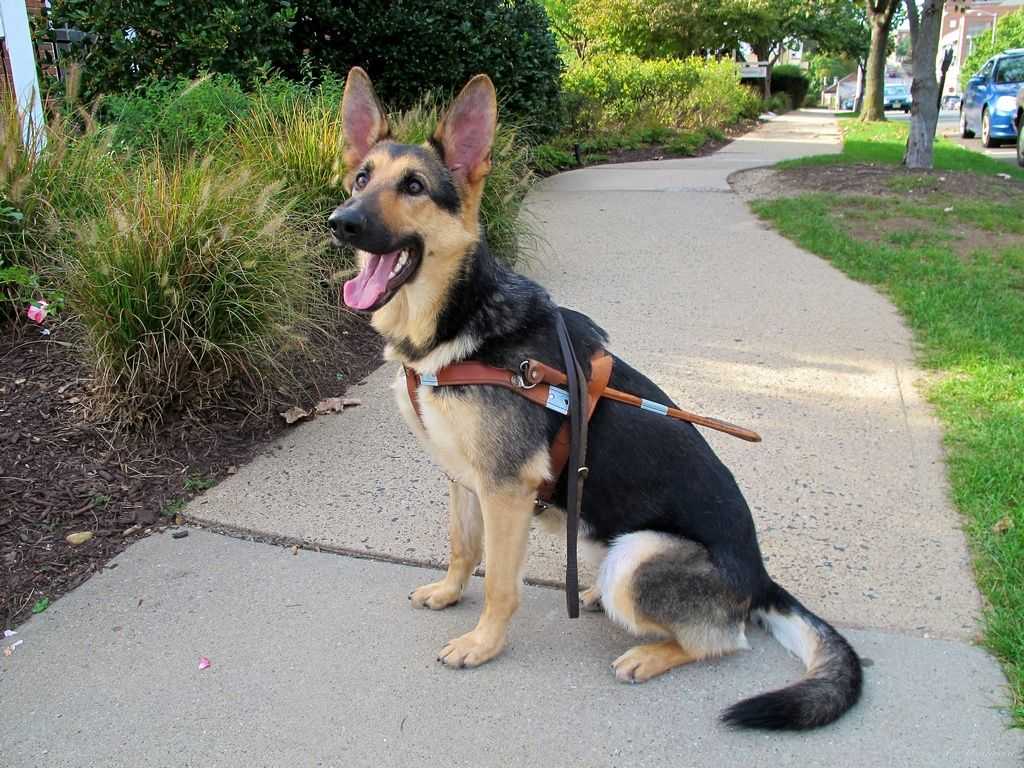 Немецкая овчарка — ещё одна собака, которая ведёт себя осторожно, но готова идти на контакт. Это дружелюбные и чрезвычайно умные собаки, которых используют не только в качестве поводырей, но и при проведении поисковых работ. Шерсть у овчарки плотнее, поэтому она нуждается в большем уходе, однако эта собака комфортно чувствует себя в холодных регионах