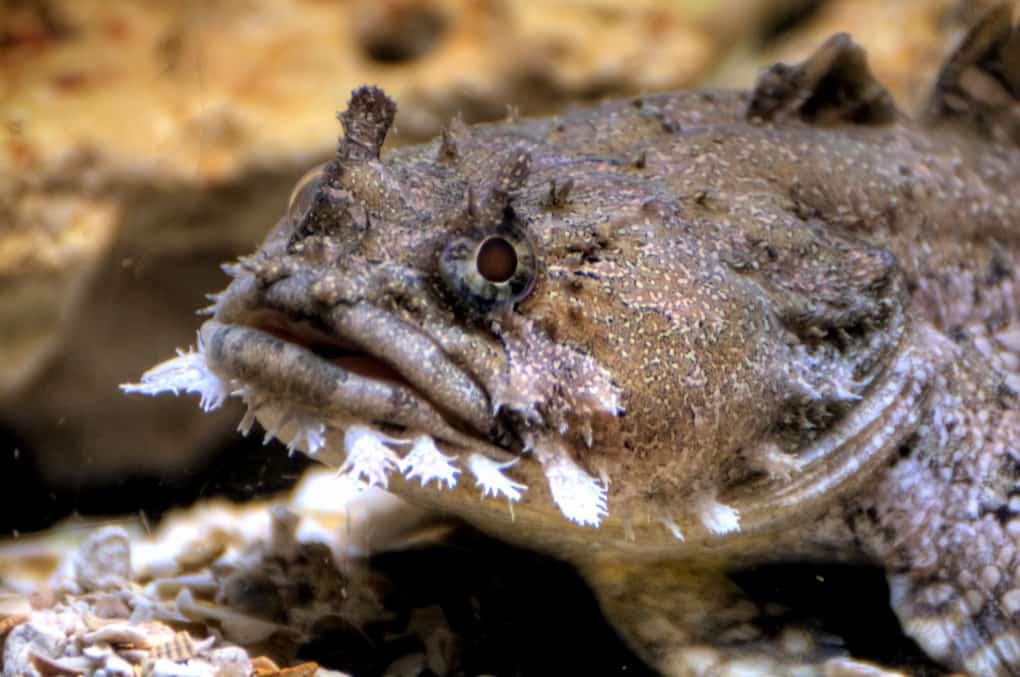 Рыба-камень или бородавчатка также особой красотой не отличается, зато с легкостью маскируется под морские камни (отсюда и название). Ареалом обитания существа являются мелководные участки Индийского и Тихого океанов. Туристы из Европы имеют шанс встретиться с бородавчаткой на курортах Египта. Беда такой встречи заключается в том, что, наступив на камень с «сюрпризом», человек получает укол в 12 «шприцов» спинного плавника бородавчатки, в которых содержится сильнейший яд. Стоит ли говорить о болевых ощущениях, если человек готов сам оторвать собственную ногу
