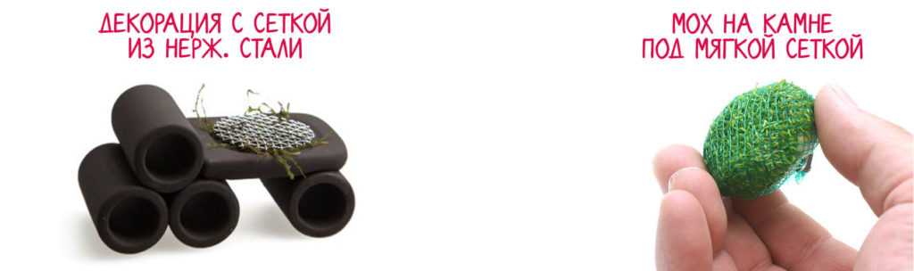 Этот способ подойдет для фиксации мхов на камнях. С помощью нитки или лески необходимо примотать растение к сетке, после чего с помощью жидкого клея прикрепить конструкцию на выбранный участок. Вместо нержавеющей сетки можно приобрести специальную площадку для культивации флоры. Например, набор ista water plants cultivation;