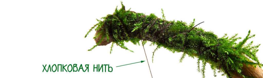 Это старый способ крепления, который сейчас практически не используется, потому что приращивание не всегда происходит до того, как нить разлагается. Однако расскажем о нем. Необходимо нарезать мох на мелкие части, уложить на поверхность и примотать хлопковой нитью. Через 2-3 месяца материал рассосется;