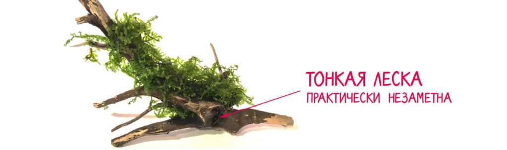 Тоже старый и не очень популярный сейчас способ. Метод подойдет для приращивания мха к плоским камням. Оформить таким образом коряги будет сложно, потому что леска хорошо просматривается в аквариуме. Еще минус — материал не разлагается в воде, поэтому через 2-4 недели придется его удалять;