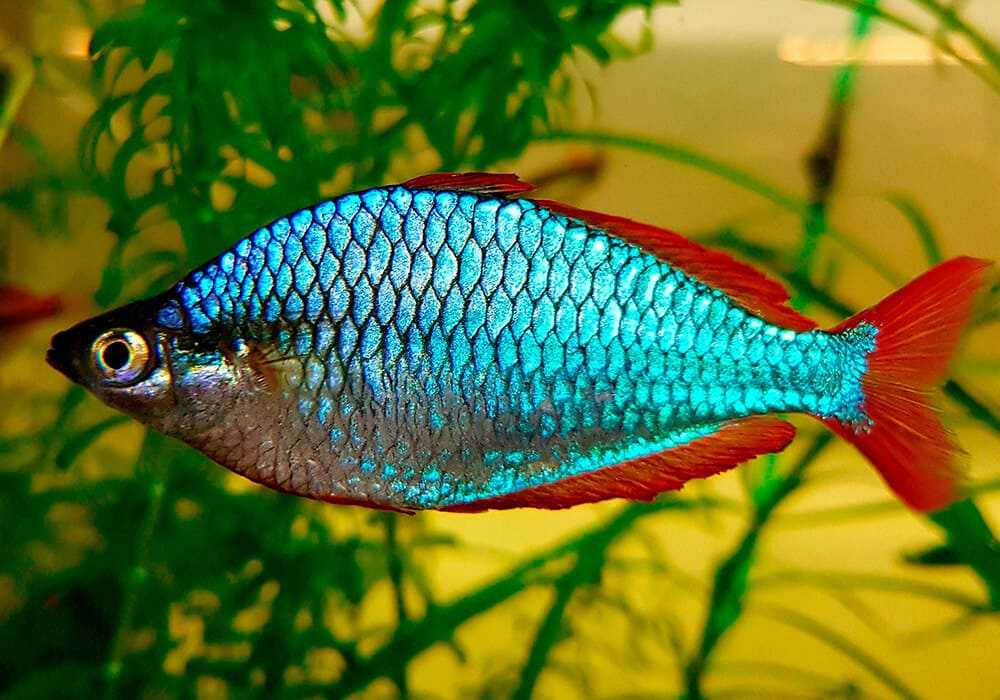 Неоновая радужница — небольшая рыбка для аквариума, обычно ее длина до 5 см. Тело приплюснуто с боков, а верхняя часть имеет горбик.