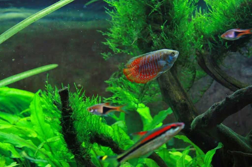 Так как наши любимцы небольших размеров, то и аквариум можно подбирать маленький. Оптимальный литраж — 100 л, которого достаточно для одной пары.