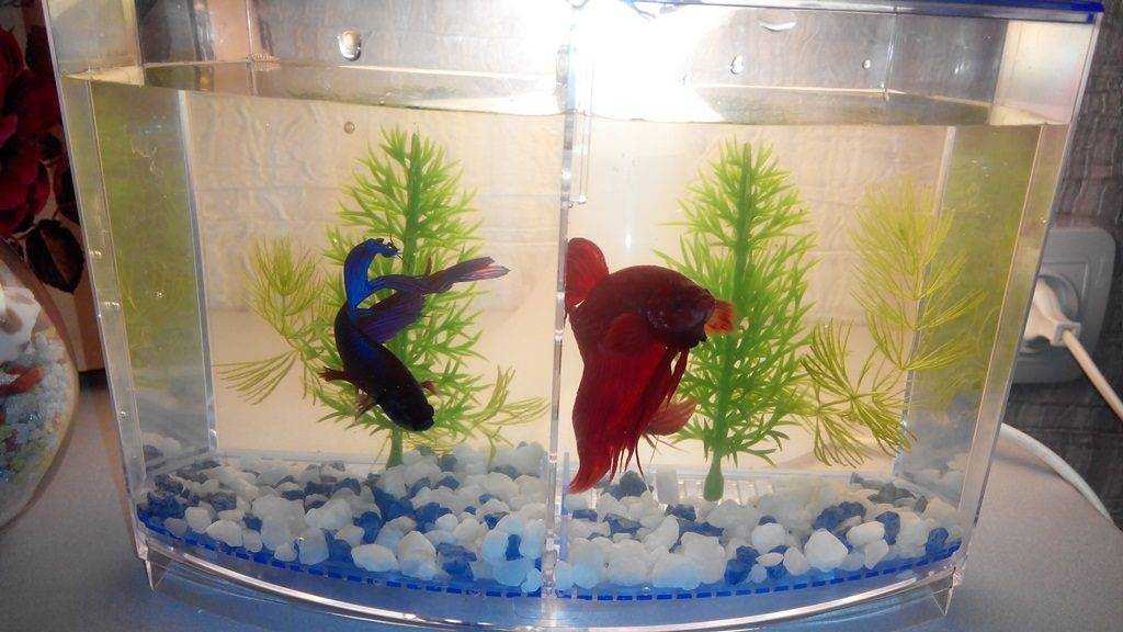 Некоторые аквариумисты выбирают большой аквариум, разделенный прозрачными перегородками, что позволяет содержать несколько самцов петушков без ущерба для их здоровья.