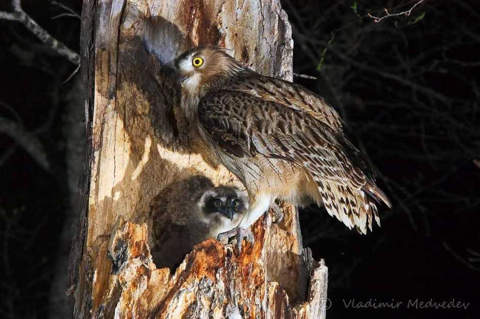 На фото филин с птенцами