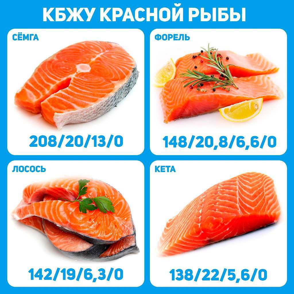 Рыба — это белковый продукт, поэтому в ней больше всего белка и практически нет углеводов. Жирные сорта содержат больше жиров (около 20%). Калорийность продукта находится в прямой зависимости от количества жира.