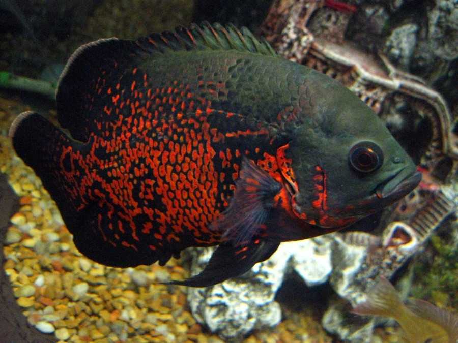 Астронотус. Также часто встречается в продаже. Выглядит необычно и красиво, но за этим внешним видом скрывается непростой характер. Астронотусы крайне агрессивны и съедят любого, кто сможет поместиться у них во рту. Кроме того, им нужен дом начиная от 200 л., но потом придется пересаживать в полутонник;
