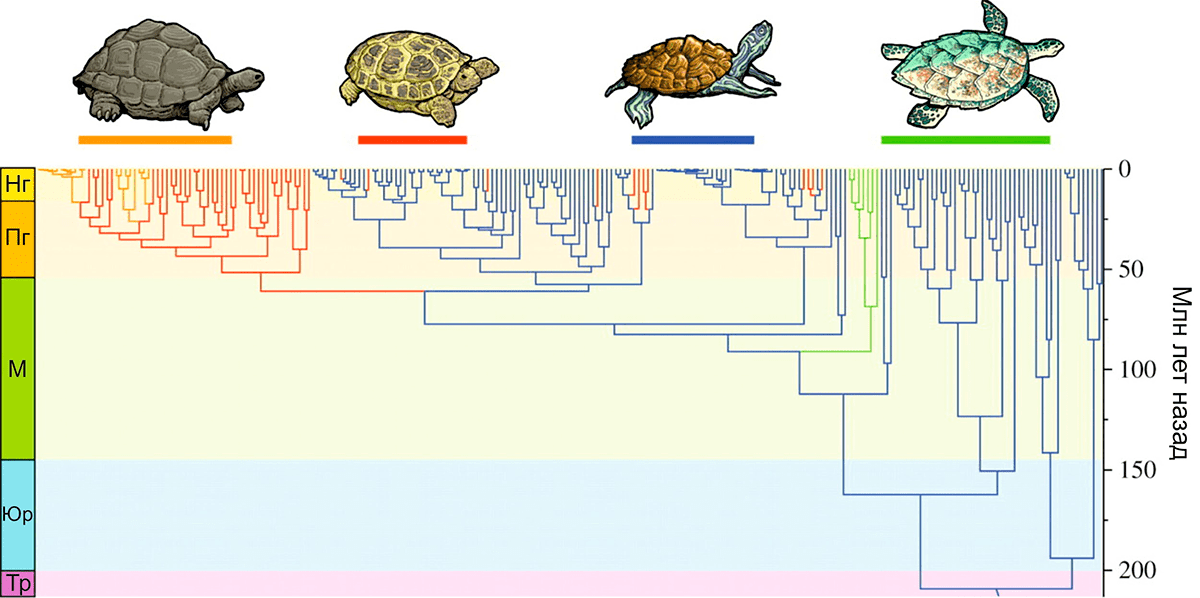 Рисунок 4. Цвета ветвей указывают на среды обитания: пресноводные (синий), морские (зеленый), материковые (красный) и островные (оранжевый). Приведены примеры видов из каждой среды обитания.