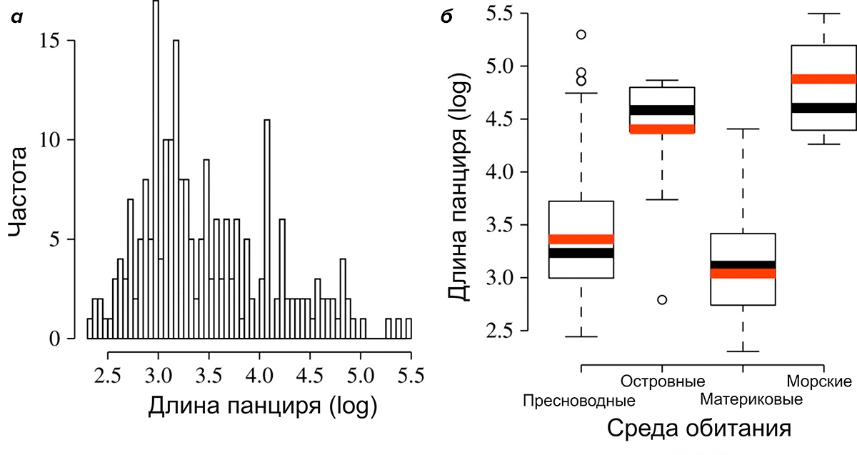 Рисунок 3. а — Значения натурального логарифма длины панциря 226 видов черепах, выбранных учеными из литературных данных для построения филогенетического дерева. б — Зависимость длины панциря от мест обитания, где красным цветом выделены значения оптимальных размеров.