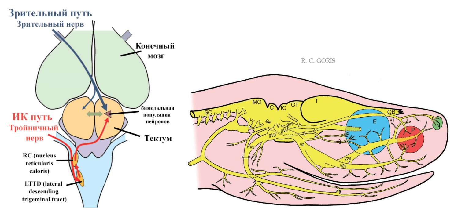 Ямки произошли от соматосенсорной системы и передают информацию в задний мозг через тройничный нерв (рис. 2). Змеи, чувствительные к инфракрасному излучению , наряду с развитием периферических органов — лицевых ямок, также развили и ядра для обработки этой дополнительной сенсорной информации.