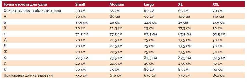 Таблица стандартных размеров для самостоятельного изготовления недоуздка.