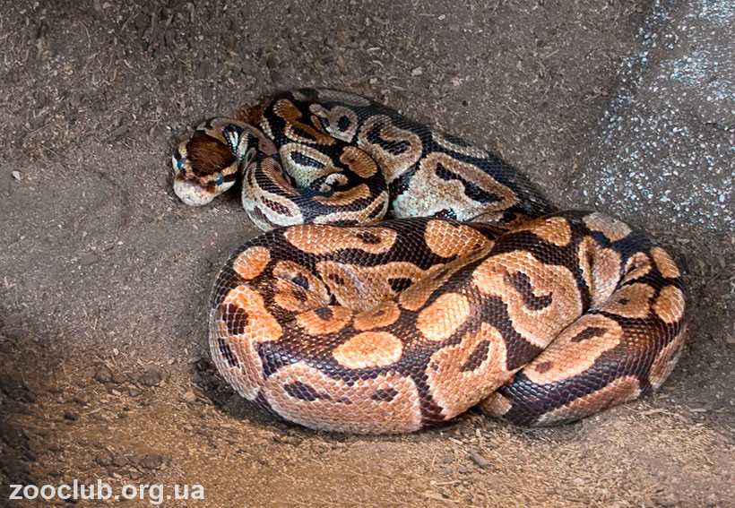 . Животное скручивает тело в кольца и прячет внутри голову. За такую привычку королевского питона еще называют «питоном-шаром» или «питоном-мячом».