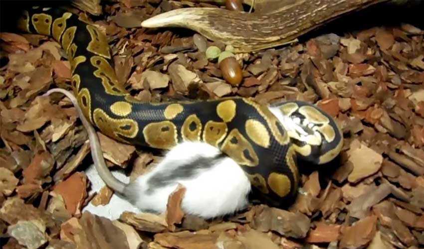 Если кормить красавца замороженной пищей, то эти проблемы сразу отпадают. Питон не будет слишком кровожадным, и возможность травмы в пылу охотничьей битвы исключается сама по себе.