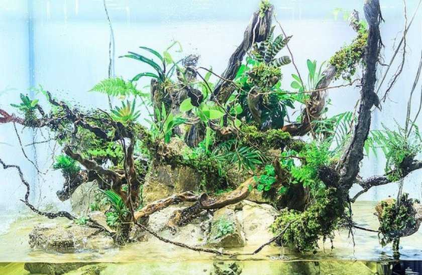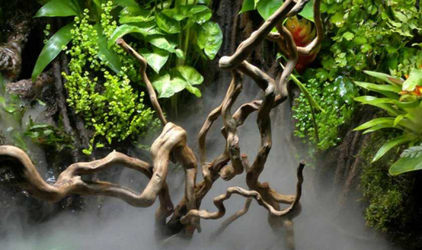 Оборудование в палюдариуме всегда прячут за декоративными элементами. Растения в наземной, а иногда и в водной части «высаживают» на камнях, кусках коры, ветках, корнях, корягах. Приобрести готовые к использованию фрагменты древесины и коряги, уже прошедшие обработку, можно в любом зоомагазине. Если вы собираете декоративные фрагменты деревьев у себя в саду или лесу, то нужно обработать такую основу кипятком, замочить в инсектициде или соляном растворе, после чего выварить или вымочить.
