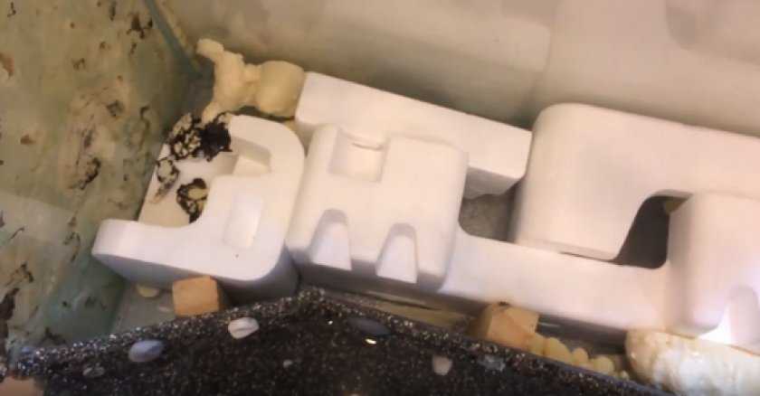 Теперь можно приступить к оформлению задней стенки палюдариума. Самыми удобными материалами признаны пенопласт и монтажная пена. Если вы выбрали пенопласт — с помощью паяльной лампы деформируйте его и придайте рельефную форму, а если пену — нанесите её на стенку, придайте ей желаемую форму и дайте высохнуть. Далее следует покрасить материал краской — желательно тёмно-коричневого или чёрного цвета. Обязательно читайте состав на этикетке и выбирайте максимально низкий уровень токсичности. После того как просохла краска, следует придать стенке декоративный вид — для этого вам помогут кокосовая стружка, листья, веточки, мелкие камни. Не ограничивайте свою фантазию и смело экспериментируйте. Чтобы приклеить материалы к стенке, используйте любой нетоксичный клей. Первый этап закончен — задний фон вашего палюдариума готов.